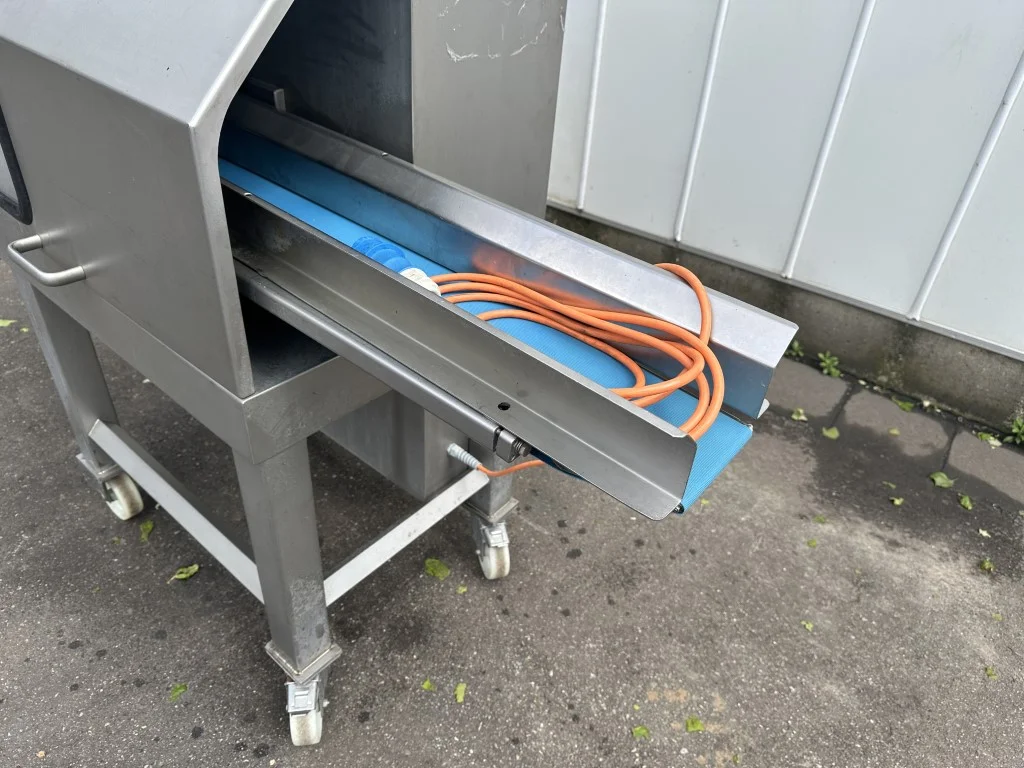 je nach gewünschtem Schnitt. Anschließend wird es dank präziser Niederhaltertechnik und Produktführung präzise und schonend geschnitten. Standardmäßig kann das geschnittene Produkt unterhalb des Messerkastens ausgeworfen werden, zum Beispiel in einen Schleuderkorb oder eine Eurokiste. Optional kann es über ein Abfuhrband zur Weiterverarbeitung transportiert werden, zum Beispiel wenn die GS 10 in eine Verarbeitungslinie integriert ist.
