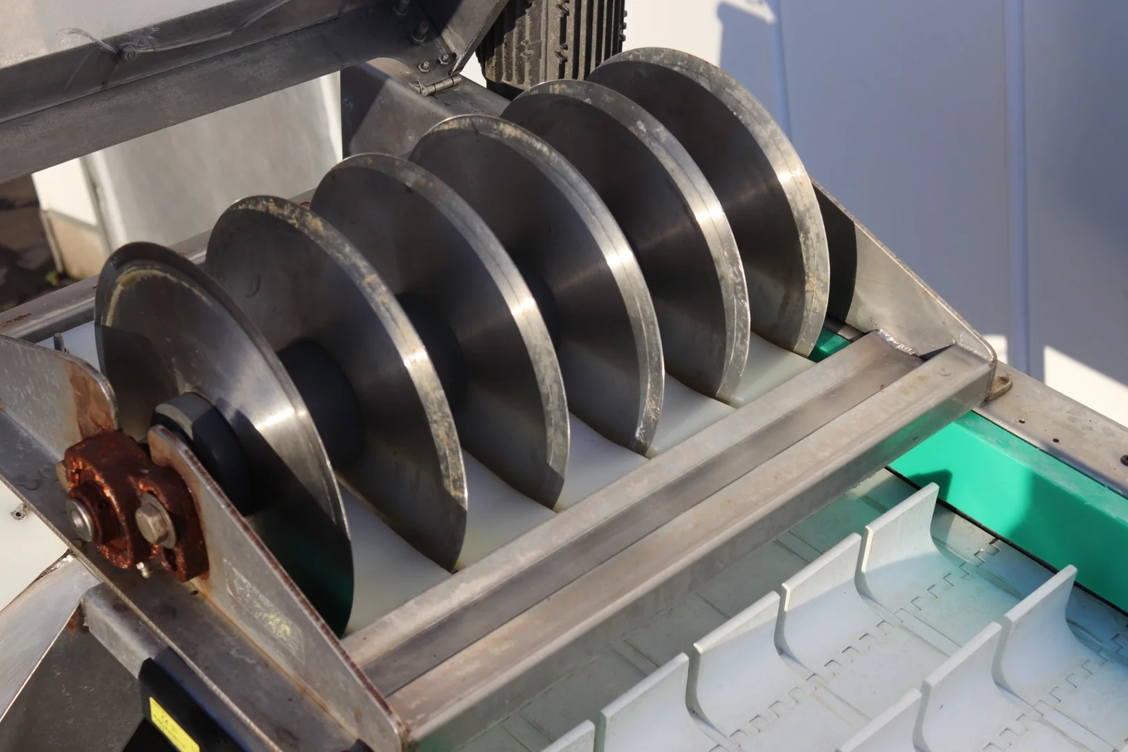 The transport belt conveys the carrots to the knives where they are cut into pieces