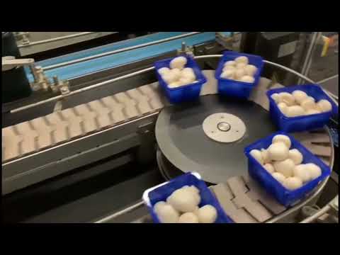 After the mushroom packages are put into import (on the in feed conveyor), they are being guided in the direction of a weighing belt to see if the weight of the packaging is just right or being over- or underweight. A divider distributes the containers into two lanes, namely: