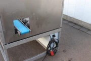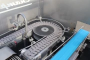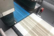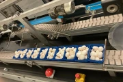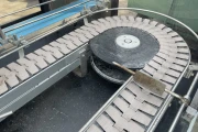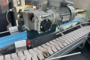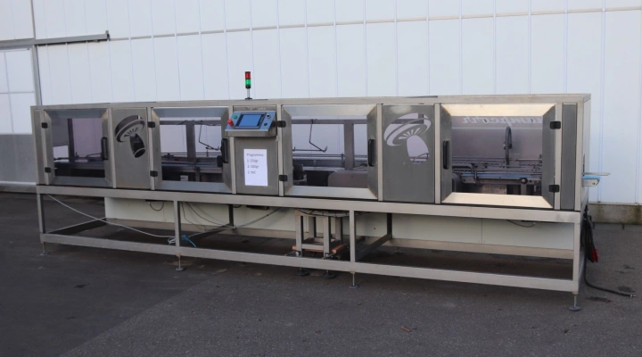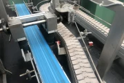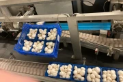 After the mushroom packages are put into import (on the in feed conveyor), they are being guided in the direction of a weighing belt to see if the weight of the packaging is just right or being over- or underweight. A divider distributes the containers into two lanes, namely: