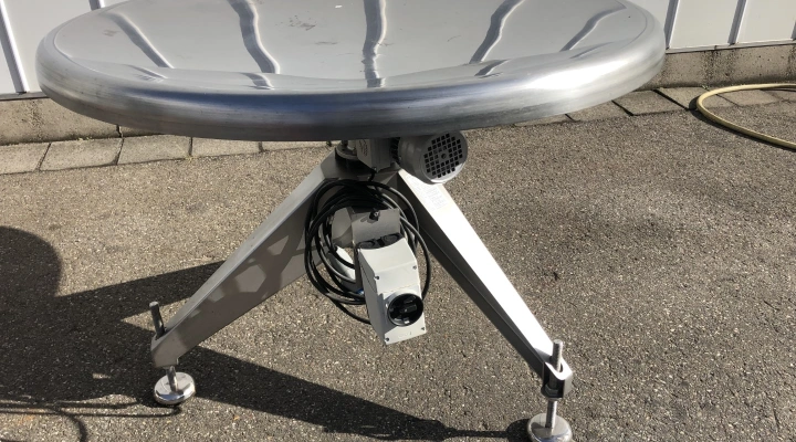 De roestvrijstalen draaitafel is licht hol gebogen om te voorkomen dat produkten en zakjes er van af vallen.