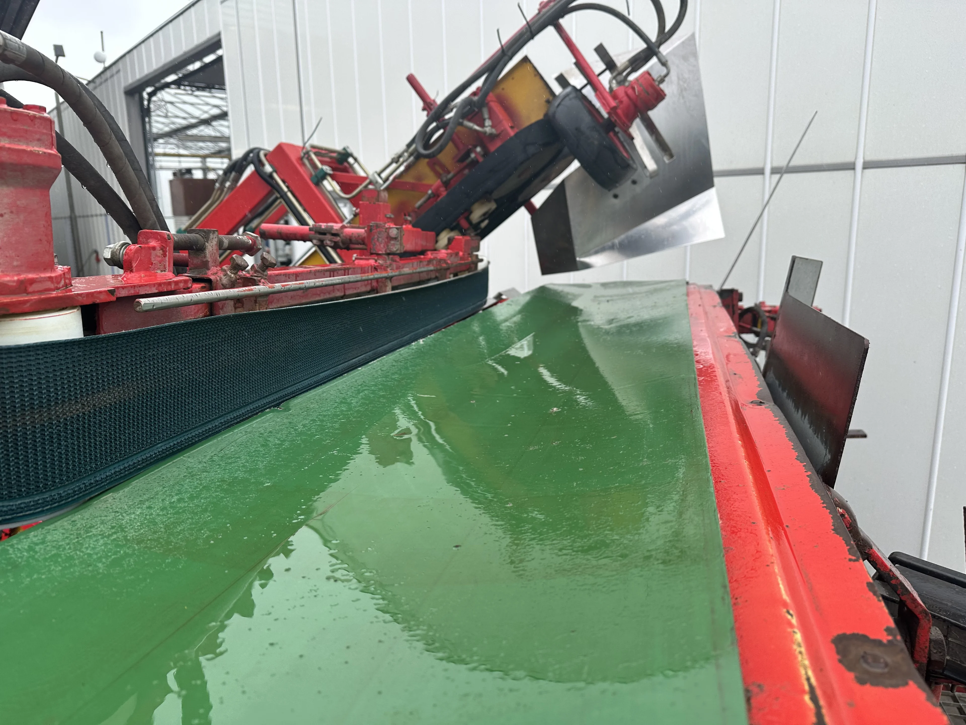 As can be seen in the photos, the right-hand clamping band is worn out; there is a new one of this with the machine, which we also mount on the machine. The small conveyor, where the leek is being placed against, will also be renewed.
