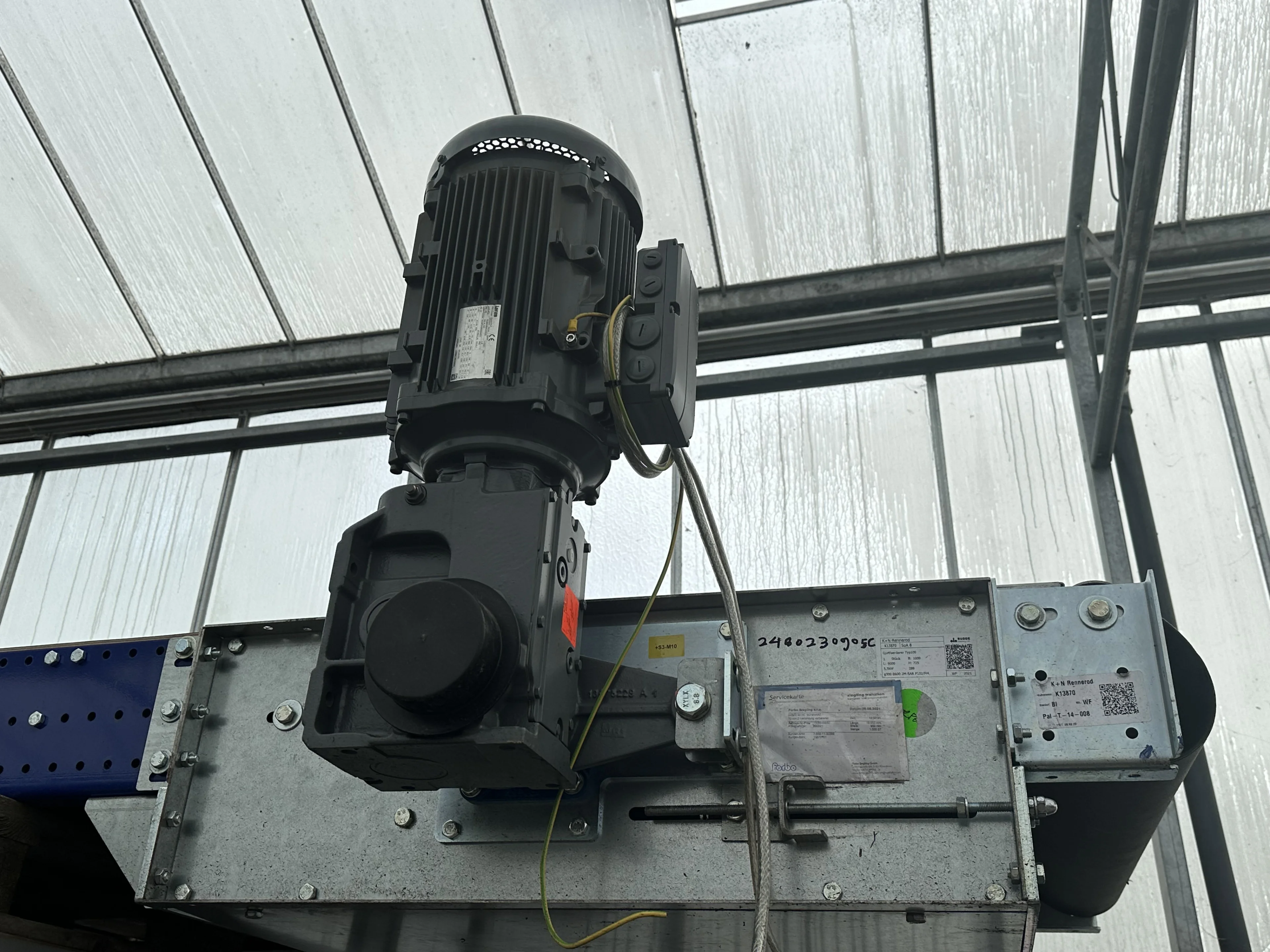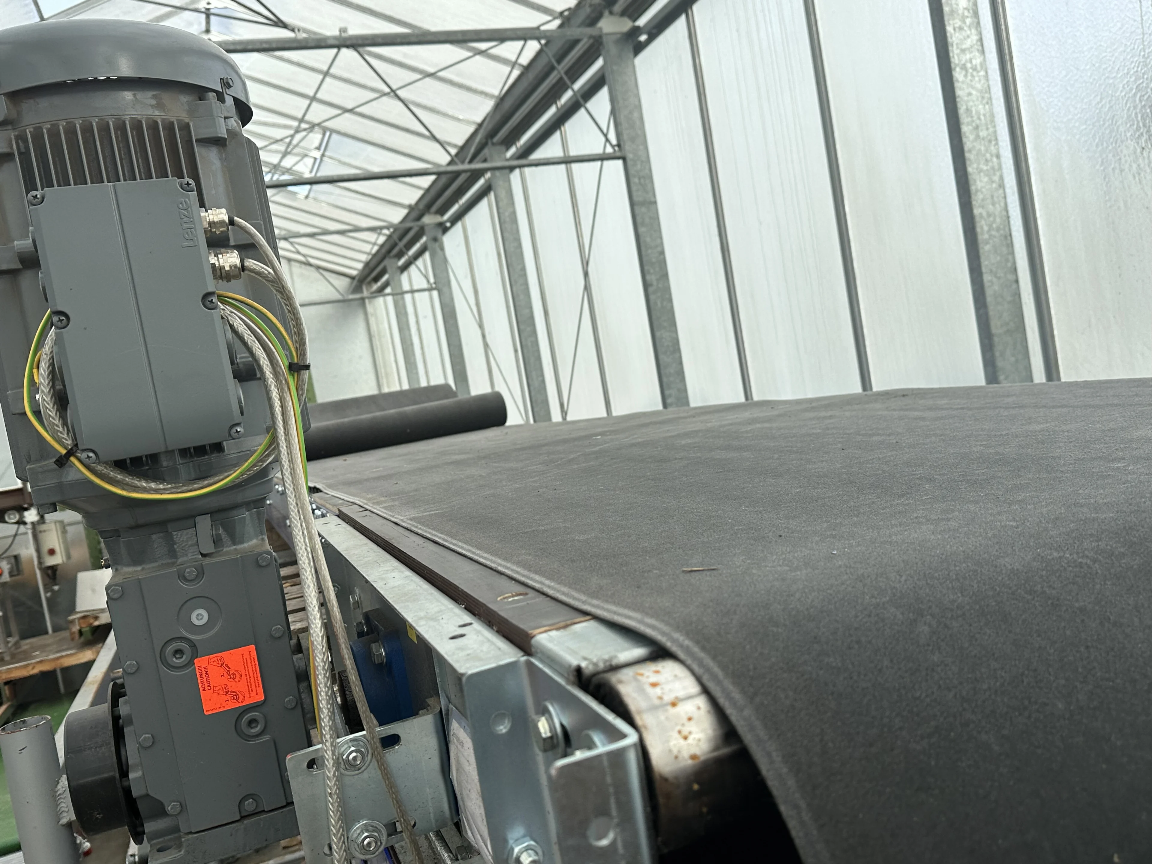 The conveyors have worked in a sorting/packaging line and were driven by a central control box and thus also controlled by an frequency inverter. Because it is not there now, the belt speed is so high. See the motor nameplate in the photos to see what kind of freq. controller can be used with this conveyor.