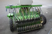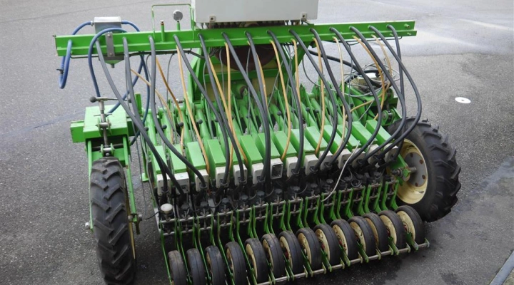 The “3-point” sower is specially developed for sowing seed in the garden. The machine is drawn by a tractor, which also supplies power and drives the electronic sowing element. The sowing part can be switched on and off separately via a display in the tractor cab, as well as the setting for the sowing distances. The parallelogram can be adjusted over the entire machine width. The depth can also be adjusted finely or roughly. A special construction of the parallelogram is chosen so that an optimal depth of seeds is achieved in case of unevenness in the surface to be seeded.