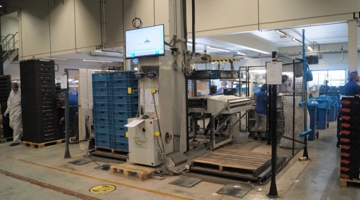 Sorma destacking machine for 2 120x120 cm pallets with 60x40 cm crates
