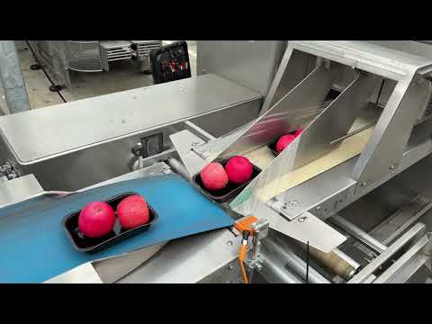 Flowpacker for packaging products with trays as well as loose products, such as eggplants and (point) peppers.