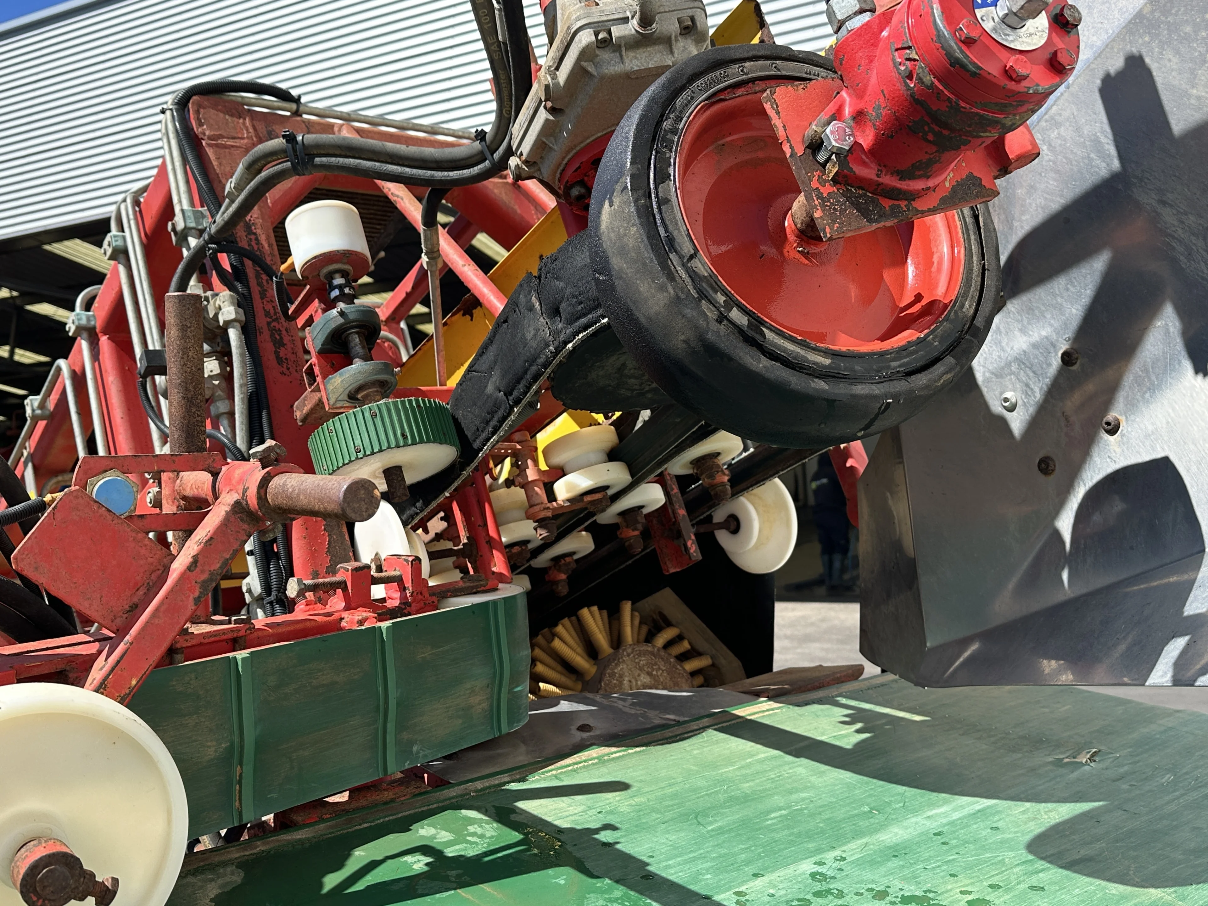 - Posteriormente, los puerros pasan por la cinta transportadora transversal, que los lleva al contenedor de puerros mediante una cinta. La misma cinta transportadora también controla la presión sobre el puerro determinando su peso en el contenedor.