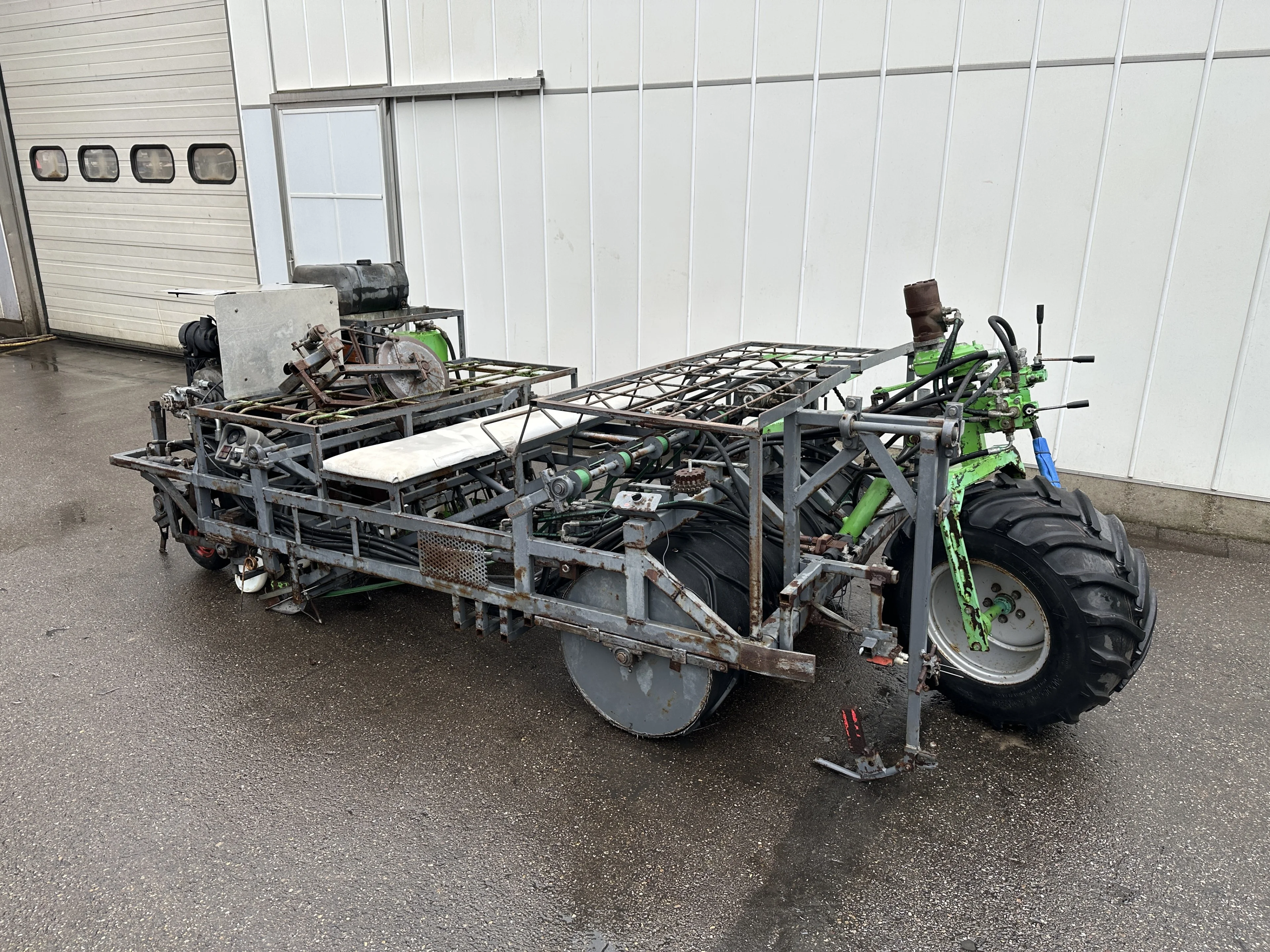 Transplanter is suitable for planting soilblocks of 4 to 5 cm (lettuce, endive etc.). Principle: Plants are transported by conveyer belts into planting sock, glide into the furrow, wheels will press the soil unto the block.