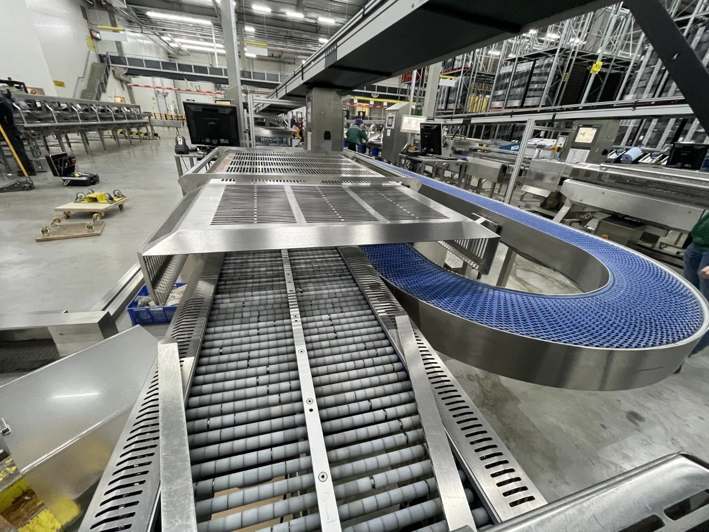 • Motorized roller conveyor for empty boxes, stainless steel construction