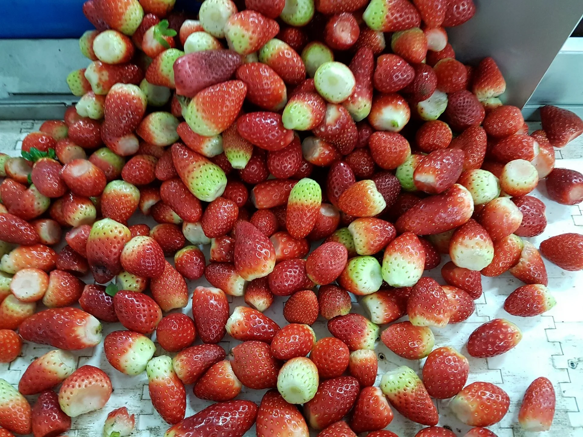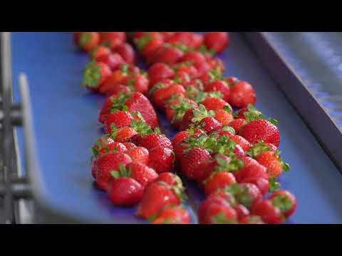 The strawberry and radish decrowning machine Mod. DF12 is highly suitable for decrowning strawberries. It can also be expanded with knives so that the strawberry or radish can be cut into two or four pieces. The machine has been specially developed for the delicate strawberry. All parts of the machine that come into contact with the strawberries are food-safe. The machine has a stainless steel construction and is equipped with two conveyor belts with cups in which the strawberries are placed and transported to the processing stations. The machine performs three steps: aligning the strawberries, decrowning the strawberries, and cutting the strawberries into pieces (the cutting function is currently not installed on the machine).
