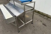 - Roller conveyor with small white free-running wheels for movement under stationary products