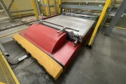 Centraal pallet aanvoersysteem. Bestaande uit een transporttrolley die onder de palletizers door rijdt. De baan zin in de vloer verwerkt. Portaal om pallets aan te voeren. 4 stapels voor lege pallets.