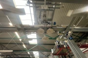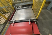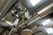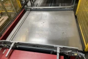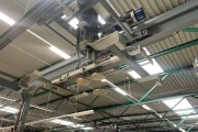 Centraal pallet aanvoersysteem. Bestaande uit een transporttrolley die onder de palletizers door rijdt. De baan zin in de vloer verwerkt. Portaal om pallets aan te voeren. 4 stapels voor lege pallets.