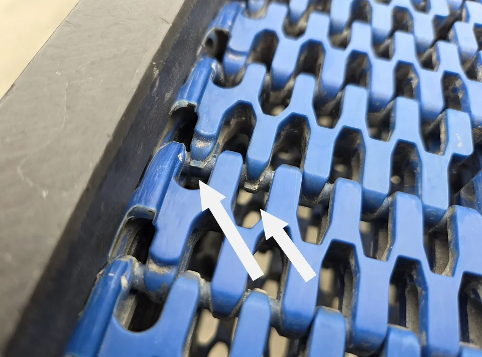 - Modulaire band heeft wat doorslijtplekken (zie foto met pijlen)