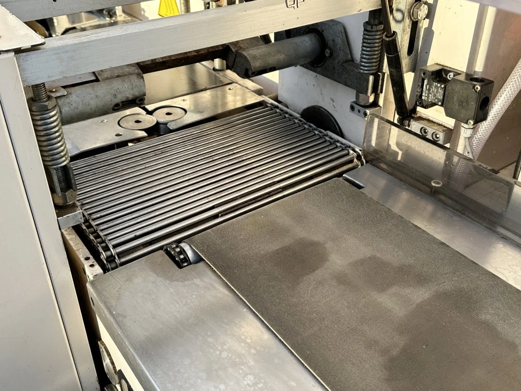 Operation: Products are placed loose or in trays by the employees onto the infeed conveyor with carriers. This infeed conveyor transports the filled trays/loose products to the infeed control. This infeed control ensures that the filled trays/loose products are taken along by the carriers at a constant speed. These carriers push the trays/loose products into the film. A rotating sealing system performs the seals, and the rotating sealing bars ensure the sealing, cutting and separation of the filled trays/loose products. During this process, a label is also automatically applied to the packaging. The sealed trays/loose products are discharged from the machine via the outfeed belt.