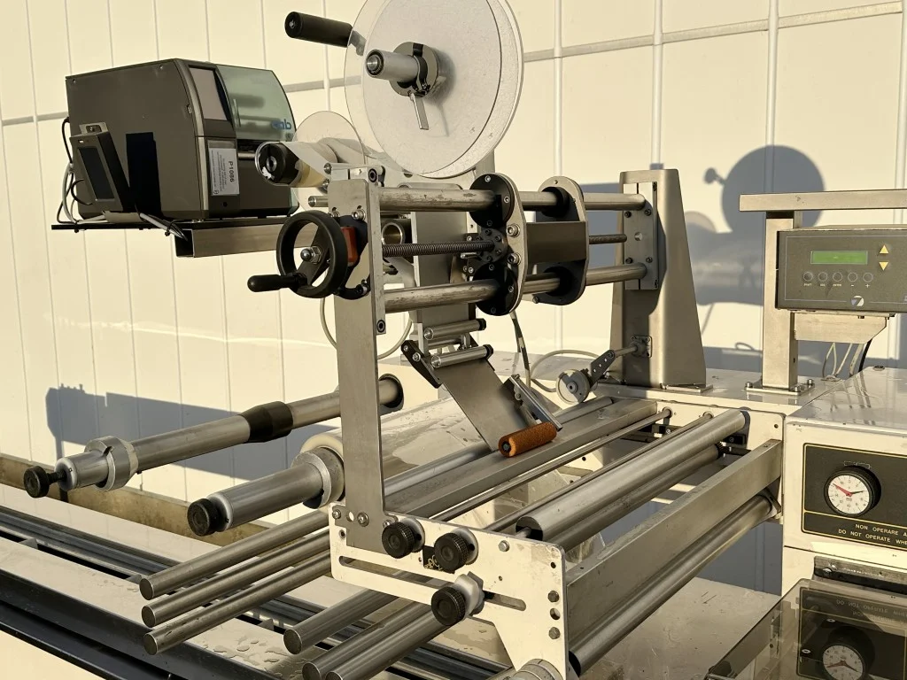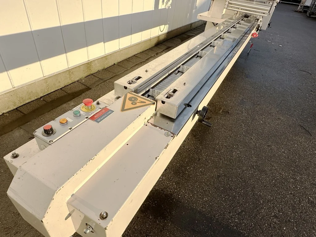 Operação: Os produtos são colocados a granel ou em bandejas pelos funcionários na esteira de alimentação com dispositivos de transporte. Esta esteira transporta as bandejas cheias/produtos a granel até o controle de entrada. O controle de entrada garante que as bandejas cheias/produtos a granel sejam conduzidas pelos dispositivos de transporte a uma velocidade constante. Estes dispositivos empurram as bandejas/produtos a granel contra o filme. Um sistema de selagem rotativa realiza a selagem, e as barras de selagem rotativas garantem a selagem, o corte e a separação das bandejas cheias/produtos a granel. Durante este processo, um rótulo também é aplicado automaticamente à embalagem. As bandejas seladas/produtos a granel são descarregadas da máquina através da esteira de saída.