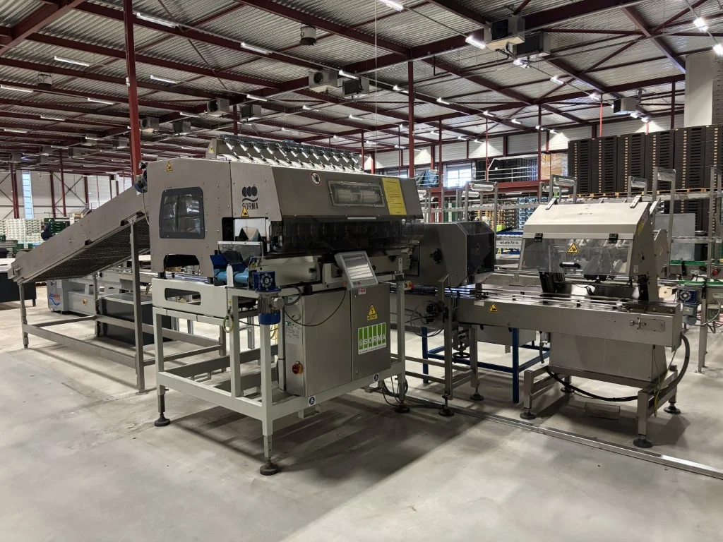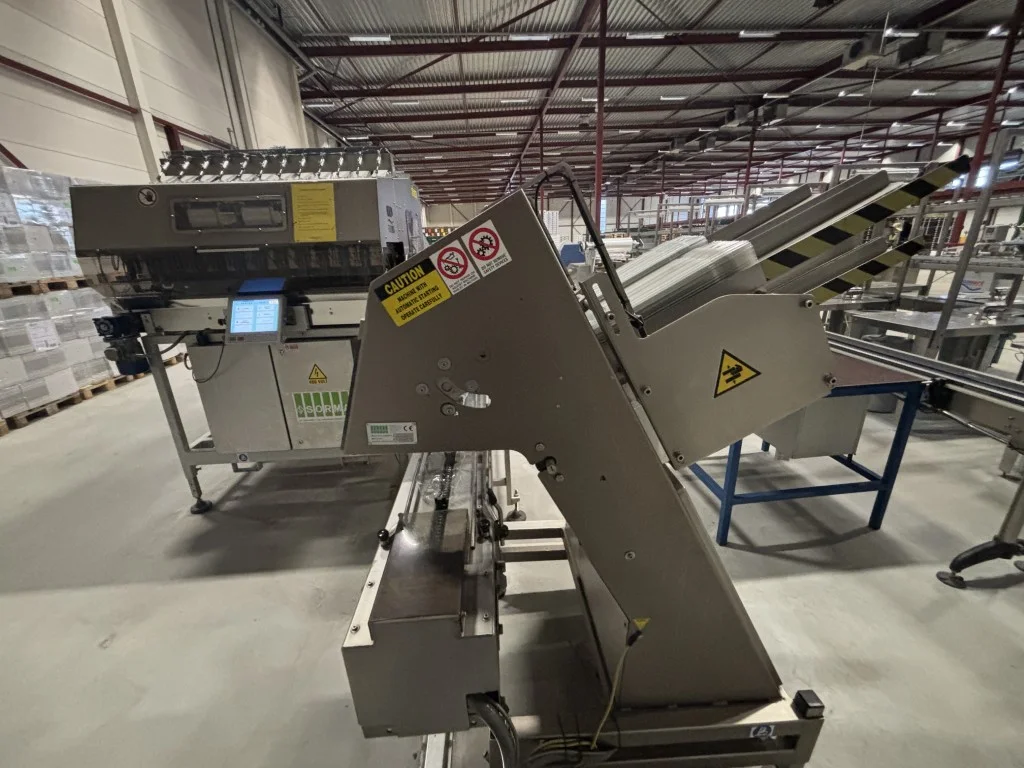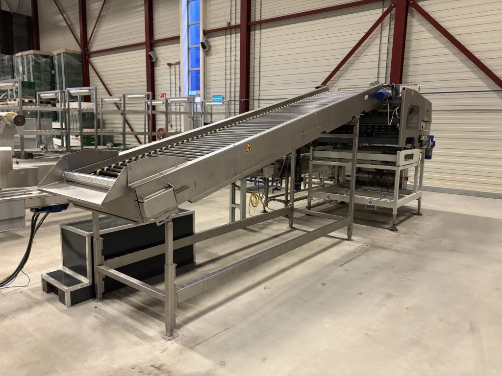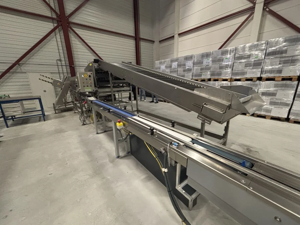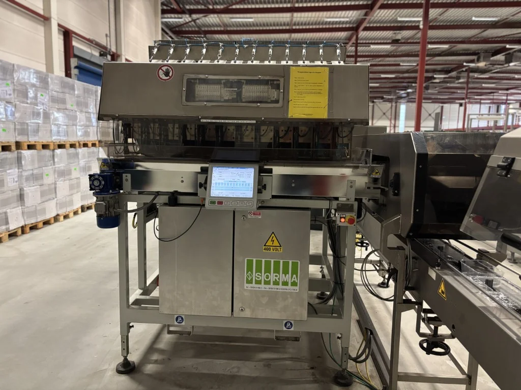 Sorma W12-126 Linha de pesagem Sorma W12-126 com elevador, enchedora de bandejas e desempilhadora.