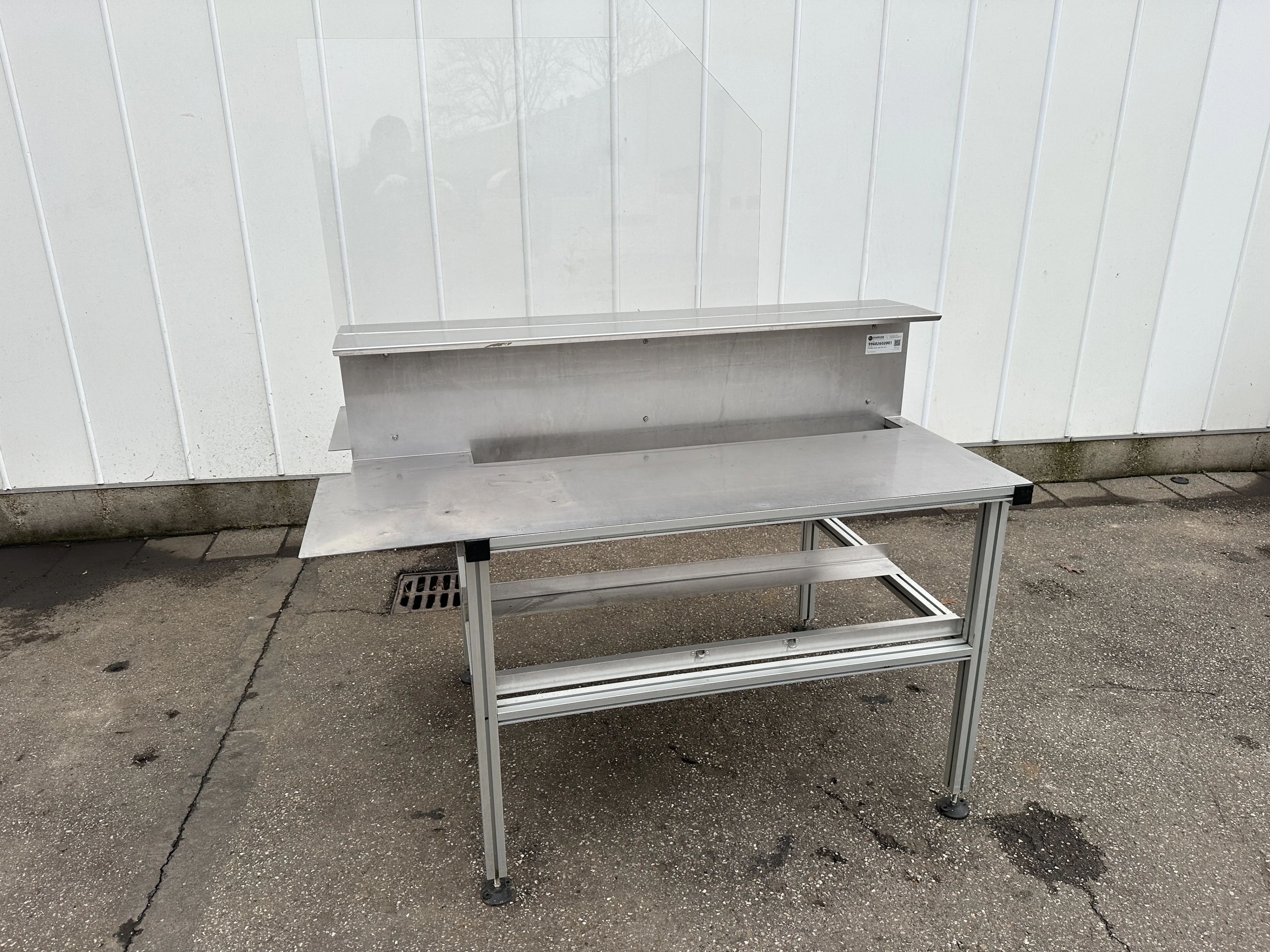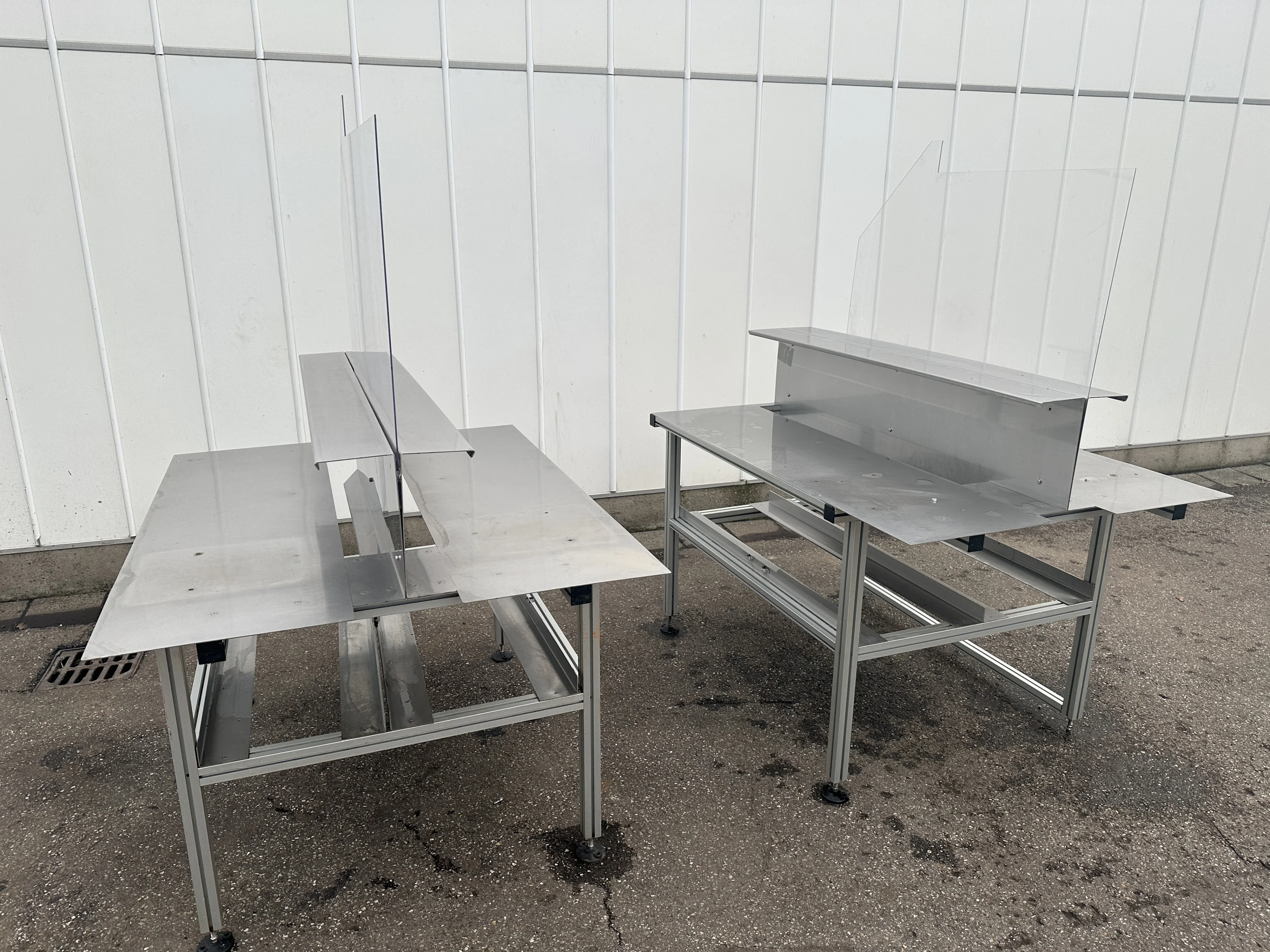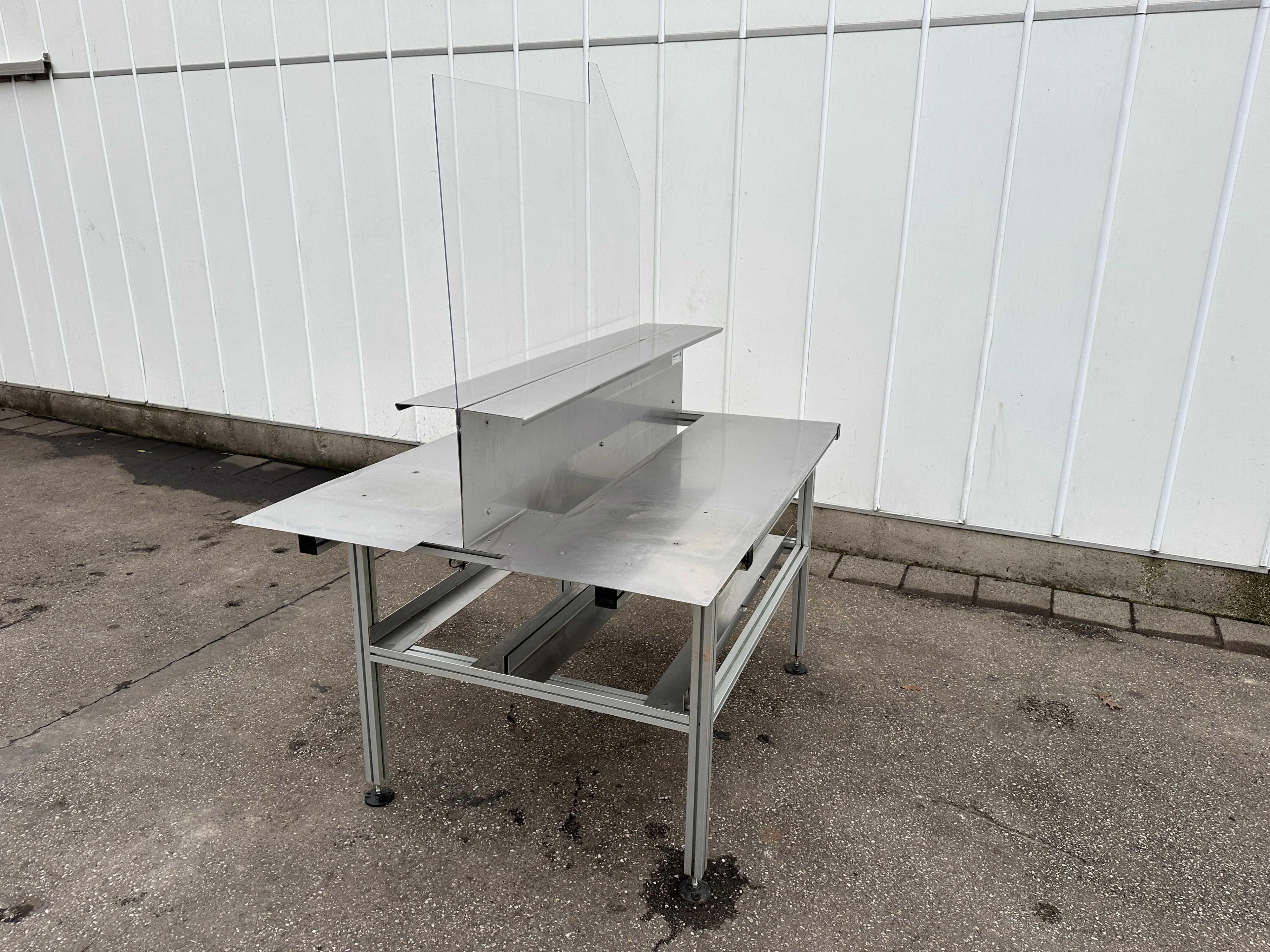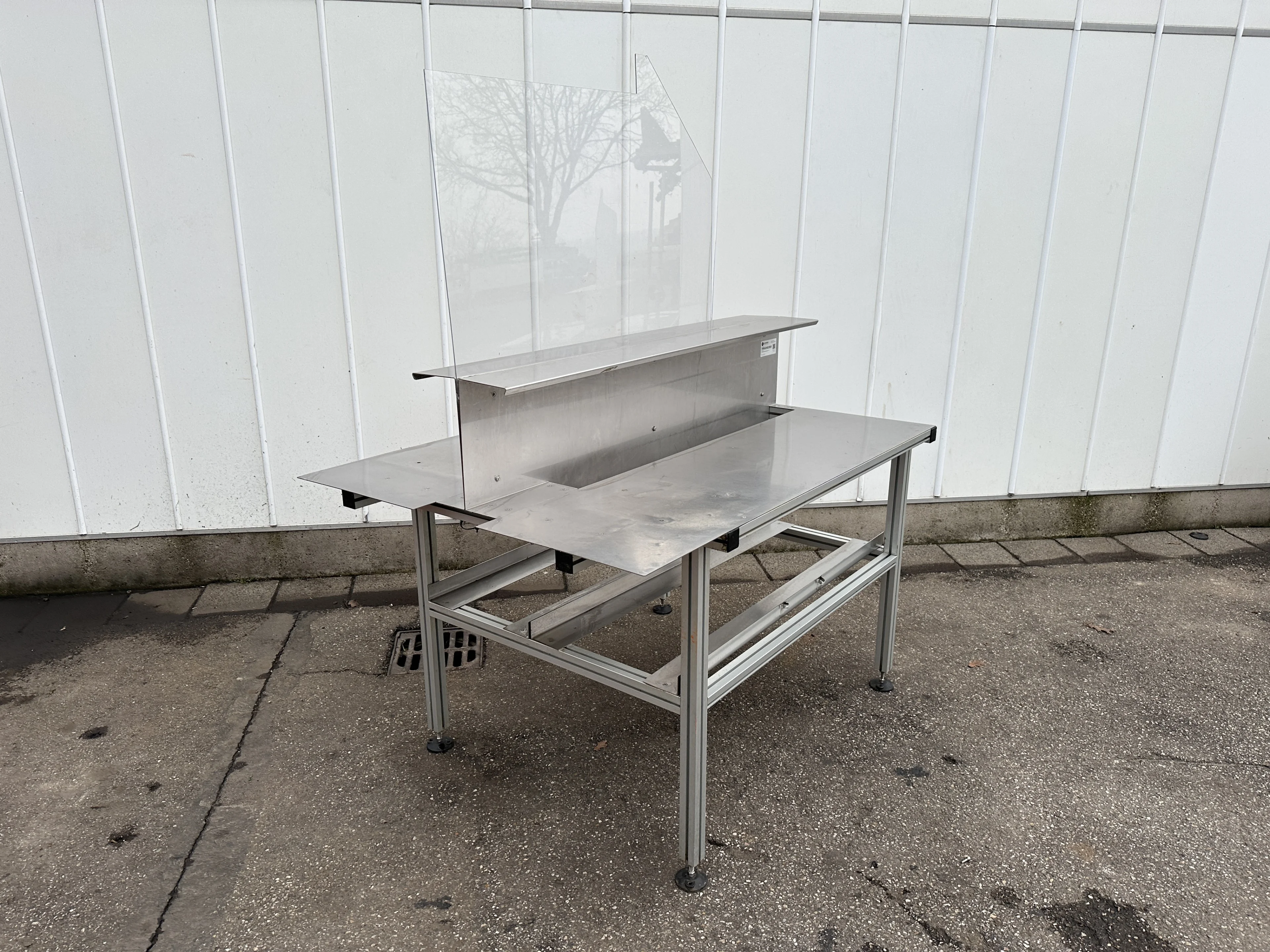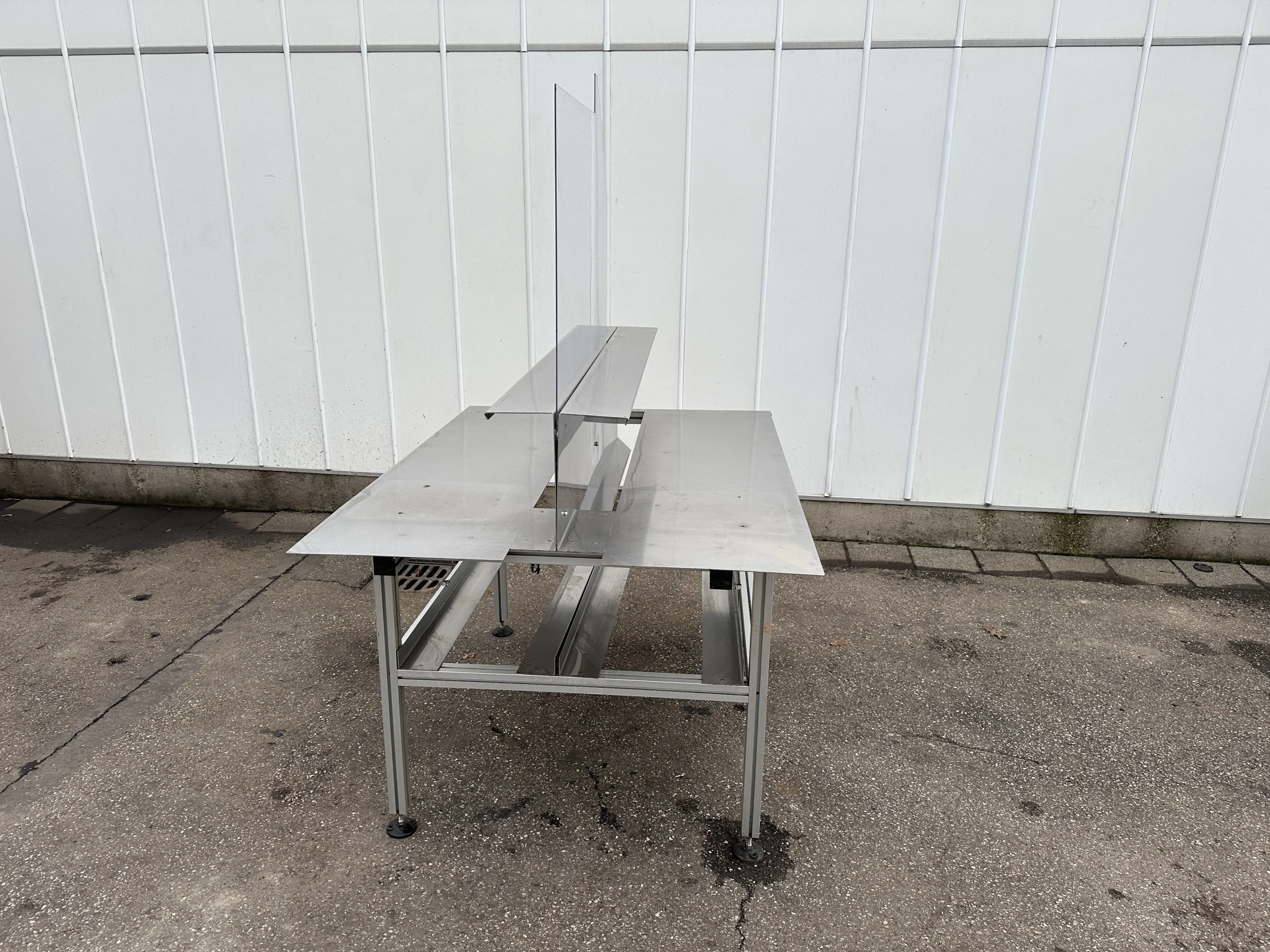 Двойной рабочий стол с алюминиевым каркасом, столешницей из нержавеющей стали и промежуточным экраном.